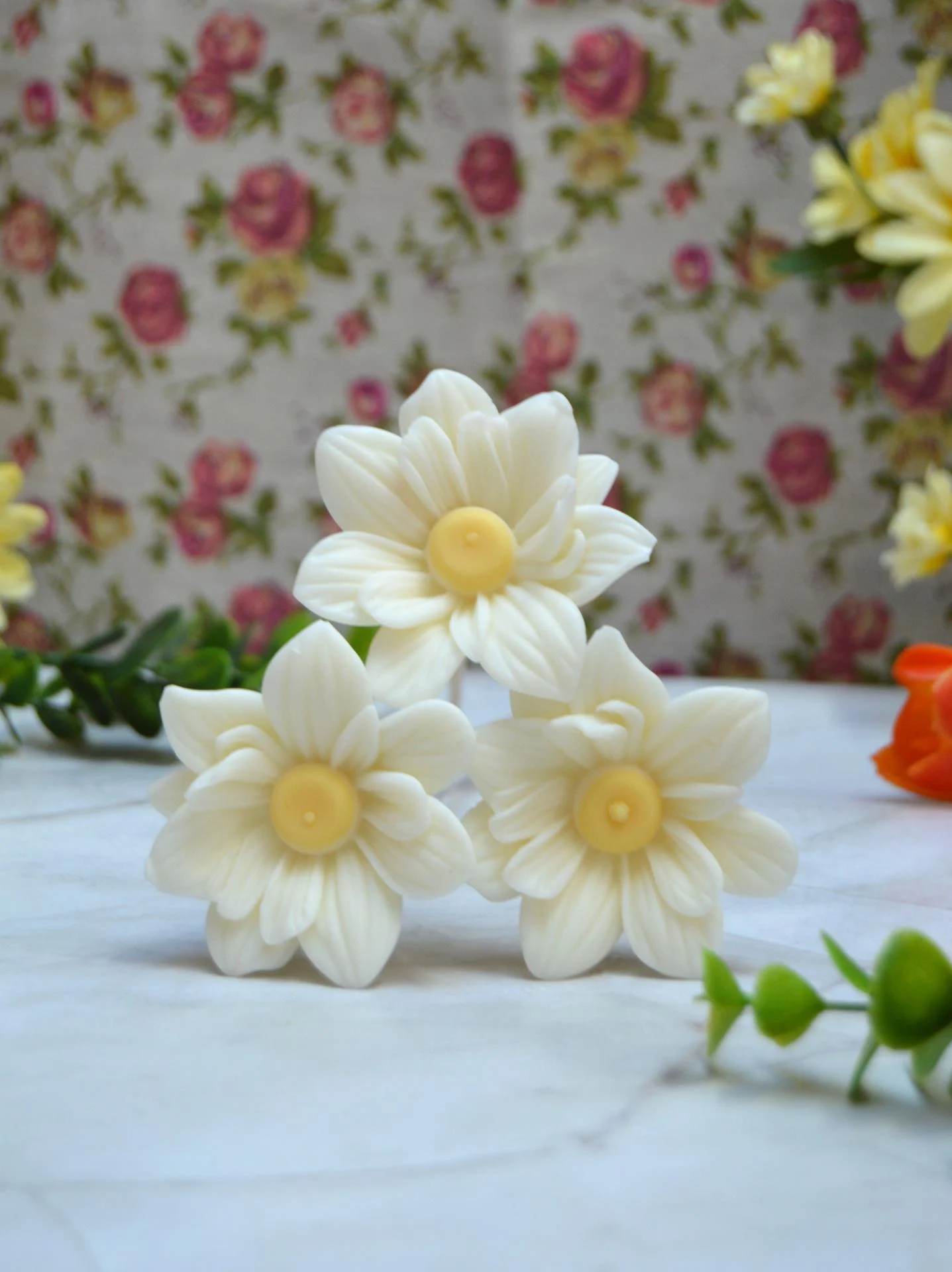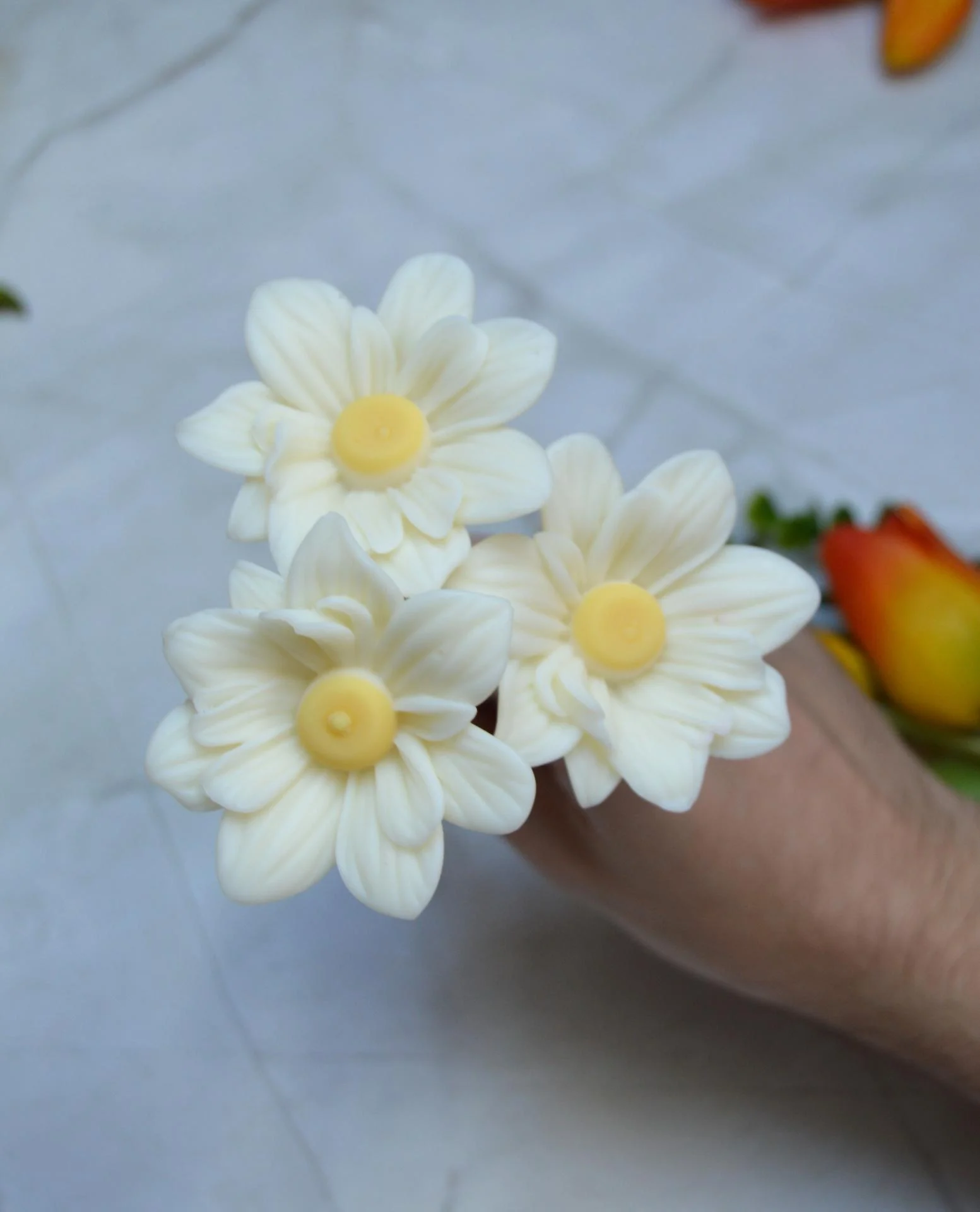 Souci blanc en cire au charme délicat et lumineux. Une fleur décorative douce et naturelle, idéale pour créer des compositions florales élégantes et personnalisées.