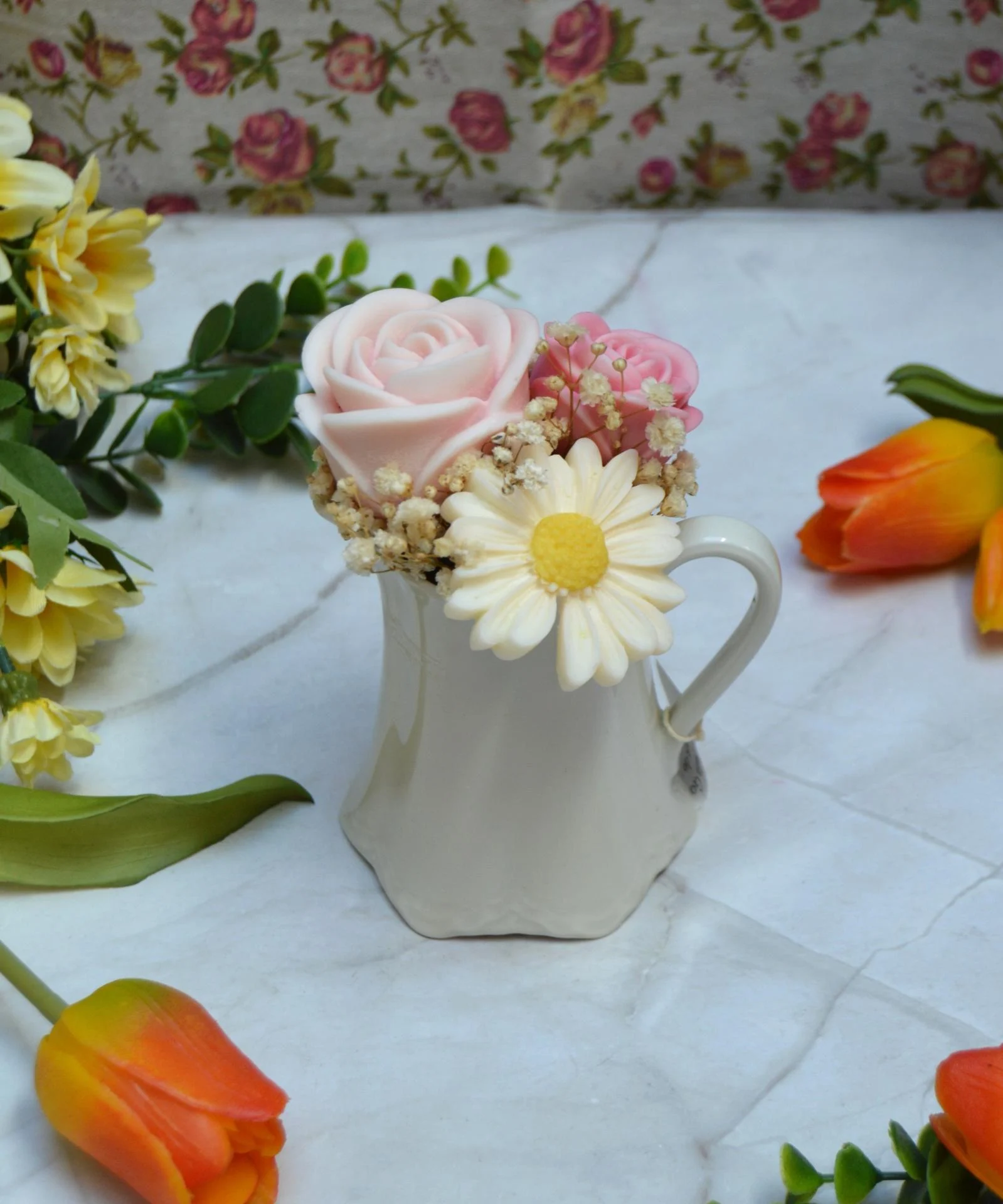 Un bouquet de fondants doux et parfumés, contenu dans un pot à lait vintage. Avec des arômes subtils de poudre de riz, il créera une atmosphère printanière et délicate.